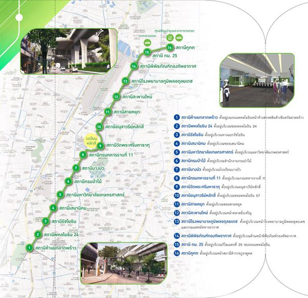 ตัวโครงการนั้นเป็นทางยกระดับทั้งหมด  มีด้วยกัน 16 สถานีครับ  โดยจะสร้างต่อจาก BTS หมอชิตไปเลย   ตรงไปตามแนวถนนพหลโยธิน  ข้ามทางยกระดับดอนเมืองโทลล์เวย์บริเวณห้าแยกลาดพร้าว  ผ่านแยกรัชโยธิน  แยกมหาวิทยาลัยเกษตรศาสตร์  ไปจนถึงบริเวณซอยพหลโยธิน 55  จากนั้นแนวเส้นทางจะเบี่ยงออกไปเลียบกับแนวถนนฝั่งซ้ายจนถึงอนุสาวรีย์พิทักษ์รัฐธรรมนูญหรือวงเวียนหลักสี่  และเบี่ยงกลับมาแนวเกาะกลางถนนพหลโยธิน  ผ่านหน้าตลาดยิ่งเจริญ  เมื่อถึงประมาณกิโลเมตรที่ 25 ของถนนพหลโยธิน  แนวเส้นทางจะเบี่ยงไปทางด้านทิศตะวันออก (ด้านเหนือของพื้นที่ประตูกรุงเทพ) ผ่านบริเวณด้านข้างของสถานีตำรวจภูธรคูคต  เข้าสู่บริเวณเกาะกลางของถนนลำลูกกา  และสิ้นสุดที่บริเวณคลองสอง (บริเวณสถานีคูคต)  ซึ่งเป็นที่ตั้งของศูนย์ซ่อมบำรุงและศูนย์ควบคุมการเดินรถซึ่งมีขนาดพื้นที่ประมาณ 130 ไร่