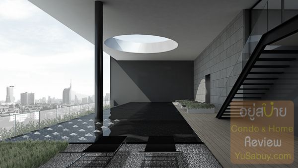 ถ้าดูในห้องตัวอย่างจะเป็นกระจกที่กั้นห้องนอนกับส่วนพักผ่อนเป็นแบบกระจกไร้เฟรม  แต่ของจริงจะมีเฟรมบานกรอบอลูมิเนียมมาให้นะครับ  บานหน้าต่างออกไปตรงระเบียงเป็นกระจกใสบานใหญ่เต็มบานดูโปร่งโล่งดี  แต่ในตัวดีไซน์นั้นไม่ได้ออกแบบจุดที่ติดตั้งซ่อนคอมเพรสเซอร์แอร์หรือตำแหน่งราวแขวนผ้ามาให้  การใช้งานจริงก็คงจะต้องมีอะไรวางเกะกะบนระเบียงอยู่บ้าง  ถ้ามองขึ้นมาแล้วเห็นเครื่องแอร์วางกระจัดกระจายก็อาจจะทำให้ความสวยของตึกเรียบๆ เท่ๆ นั้นลดลงไปได้เหมือนกัน