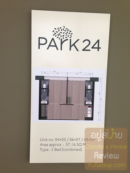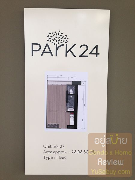 ห้องของ Park24 นี้จะมี 2 แบบคือ 1 ห้องนอน 28.08 ตารางเมตร กับ 2 ห้องนอน 57.16 ตารางเมตรครับ พื้นที่ของแบบ 2 ห้องนอนก็คือเอาแบบ 1 ห้องนอนมารวมกันโดยเอาผนังออกเฉยๆ แต่ข้อพิเศษคือแบบ 2 ห้องนอนนี้เวลาออกโฉนดครอบครองกรรมสิทธิ์โครงการจะไม่ได้ออกโฉนดใบเดียวครับ แต่จะออกโฉนด 2 ใบแบ่งครึ่งพื้นที่กัน คือถ้าซื้อแบบ 2 ห้องนอนไว้แล้วในอนาคตอยากจะขายห้อง ก็จะสามารถแบ่งขายแค่ครึ่งนึงแบบ 1 ห้องนอนได้ด้วย ตรงนี้เป็นไอเดียที่แปลกและน่าสนใจดียังไม่ค่อยเคยเห็นใครทำกัน