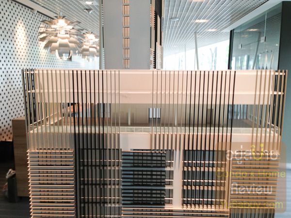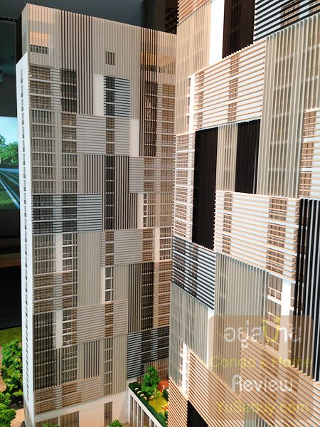 จุดนึงที่น่าจะต้องพูดถึงเกี่ยวกับการดีไซน์ก็คือเรื่ององค์ประกอบของที่เป็นแผงฟินทั้งแนวตั้งและแนวนอนบนตัวอาคารครับ หน้าตัดของตัวแผงฟินนี้เป็นสี่เหลี่ยมผืนผ้าทำให้เวลาเรามองแนวตรงๆ(คือมองหน้าตัดด้านกว้างของสี่เหลี่ยมผืนผ้า)เราก็จะเห็นระนาบของแผงฟินนั้นบางลง แต่ถ้าเราบิดมุมมองไปมองด้านข้าง(ซึ่งเราจะเห็นในส่วนด้านยาวของหน้าตัดสี่เหลี่ยมผืนผ้าด้วย)ก็จะเห็นระนาบที่ใหญ่ขึ้น ก็เป็นดีไซน์ที่มาเล่นกับมุมมองในจุดต่างๆของอาคารครับ(ไว้ผมจะสเก็ตกราฟิกให้ดูคร่าวๆในรีวิวฉบับเต็ม) แต่ข้อจำกัดข้อหนึ่งที่จะเกิดขึ้นตามมาแน่นอนคือเรื่องมุมมองครับ ยังไงมุมมองจากในห้องก็จะถูกจำกัดมากกว่าห้องโล่งๆแบบปกติแน่นอน ตรงนี้ก็ต้องชั่งน้ำหนักดูหล่ะครับว่าแต่ละคนโอเคกับดีไซน์แบบนี้หรือไม่