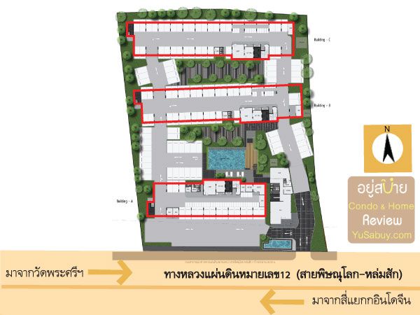 คอนโดนั้นวางตัวอาคารในแนวขนานกับถนนมิตรภาพด้านหน้าครับ มี 3 ตึกแยกกัน ไล่มาตั้งแต่ด้านหน้าเป็น Building A , B และ C ตามลำดับ ระยะห่างระหว่าง 2 ตึกด้านหน้าคือ Building A และ B จะมากกว่า 2 ตึกด้านหลังคือ B และ C ครับ