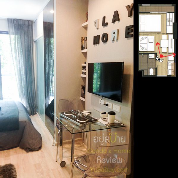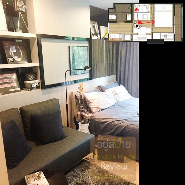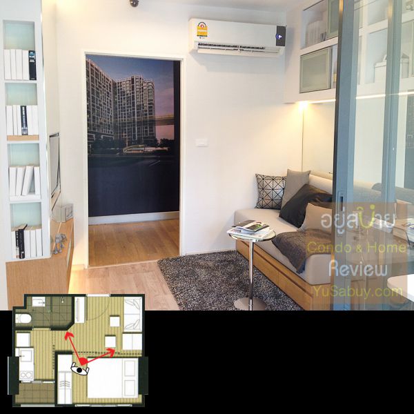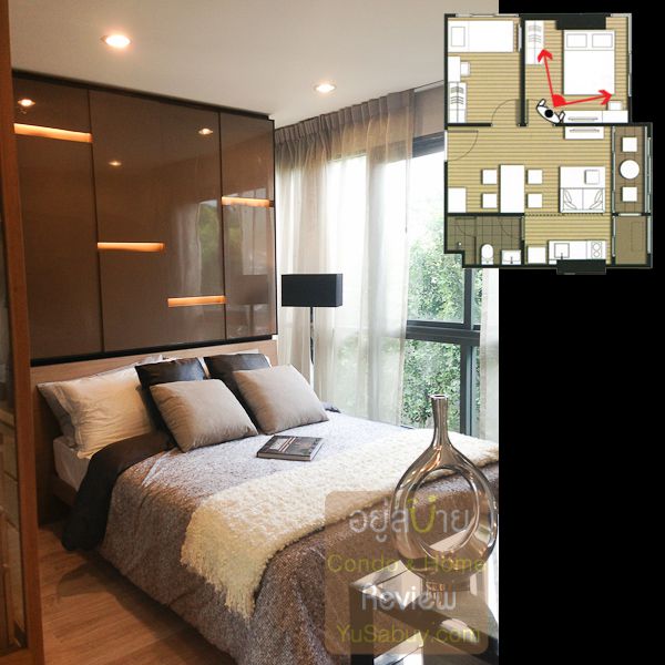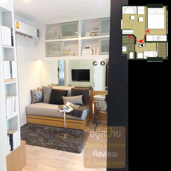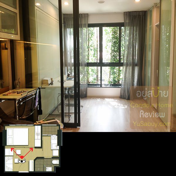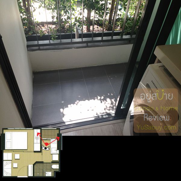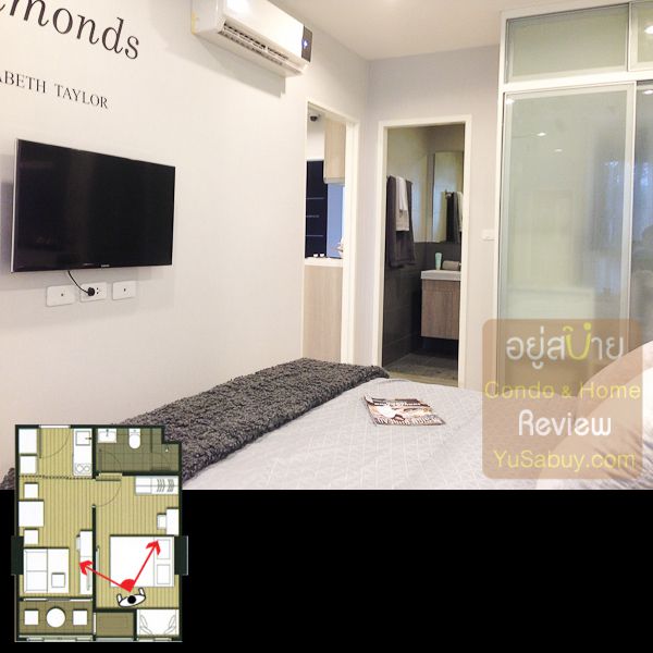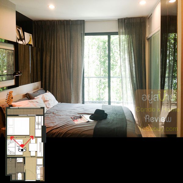 ห้องน้ำในแบบนี้จะต้องเข้าจากภายในห้องนอนเท่านั้น ระยะตรงปลายเตียงนั้นน้อยไปพอสมควร ถ้าลองแขวนทีวีกับผนังแล้วเวลาเดินจะต้องเอี้ยวตัวนิดนึงครับ(ลองดูรูปที่ถ่ายห้องตัวอย่างด้านล่าง) ส่วนระเบียงด้านนอกก็เป็น Double Door แยกที่วางคอมเพรสเซอร์แอร์ออกไปเป็นสัดส่วนดี การวางตำแหน่งคอมฯแอร์ตรงนี้ข้อดีคือเวลาอยู่ในพื้นที่ส่วนพักผ่อนหรืออยู่ตรงระเบียงก็จะไม่รกตา แต่ก็จะทำให้พื้นที่ที่จะทำหน้าต่างในห้องนอนน้อยลงไปด้วย นอกจากนี้ห้องแบบ 1 ห้องนอนก็มี Double Door ตามเอกลักษณ์ของไอดีโอมาให้ด้วยครับ