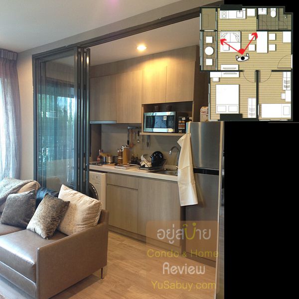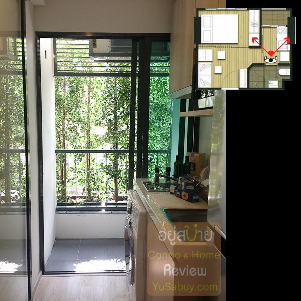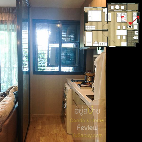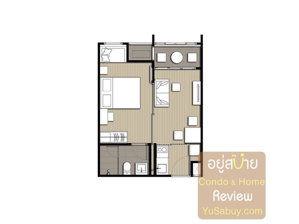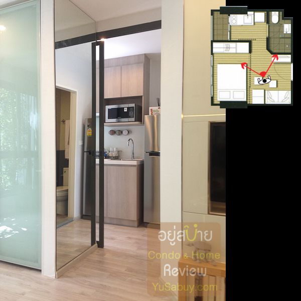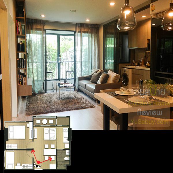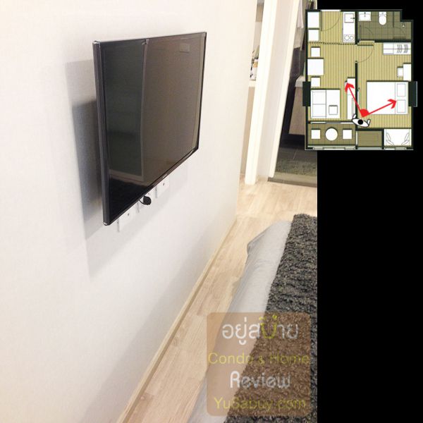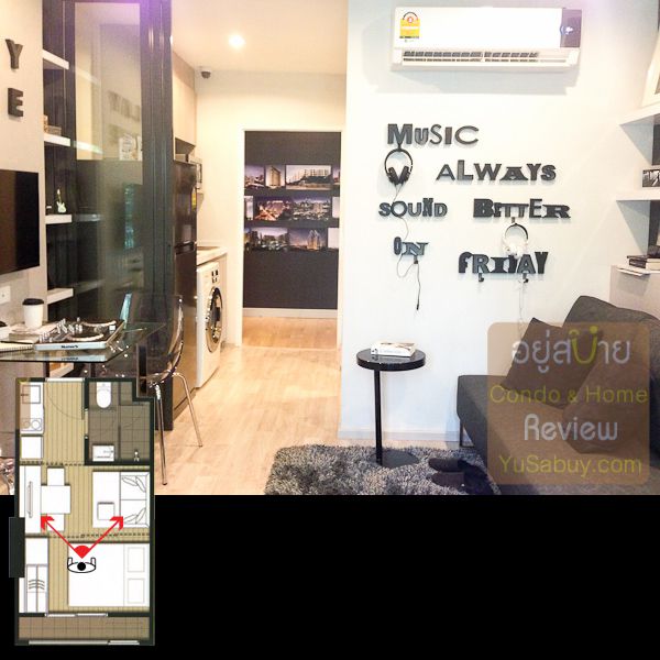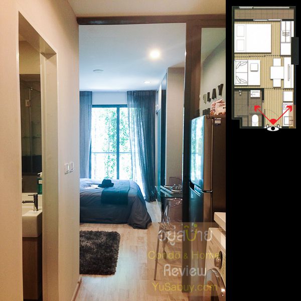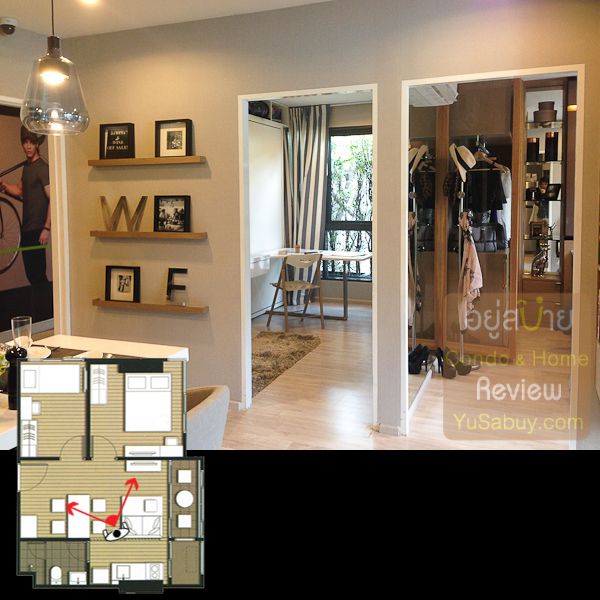 ห้องน้ำในแบบนี้จะต้องเข้าจากภายในห้องนอนเท่านั้น ระยะตรงปลายเตียงนั้นน้อยไปพอสมควร ถ้าลองแขวนทีวีกับผนังแล้วเวลาเดินจะต้องเอี้ยวตัวนิดนึงครับ(ลองดูรูปที่ถ่ายห้องตัวอย่างด้านล่าง) ส่วนระเบียงด้านนอกก็เป็น Double Door แยกที่วางคอมเพรสเซอร์แอร์ออกไปเป็นสัดส่วนดี การวางตำแหน่งคอมฯแอร์ตรงนี้ข้อดีคือเวลาอยู่ในพื้นที่ส่วนพักผ่อนหรืออยู่ตรงระเบียงก็จะไม่รกตา แต่ก็จะทำให้พื้นที่ที่จะทำหน้าต่างในห้องนอนน้อยลงไปด้วย นอกจากนี้ห้องแบบ 1 ห้องนอนก็มี Double Door ตามเอกลักษณ์ของไอดีโอมาให้ด้วยครับ