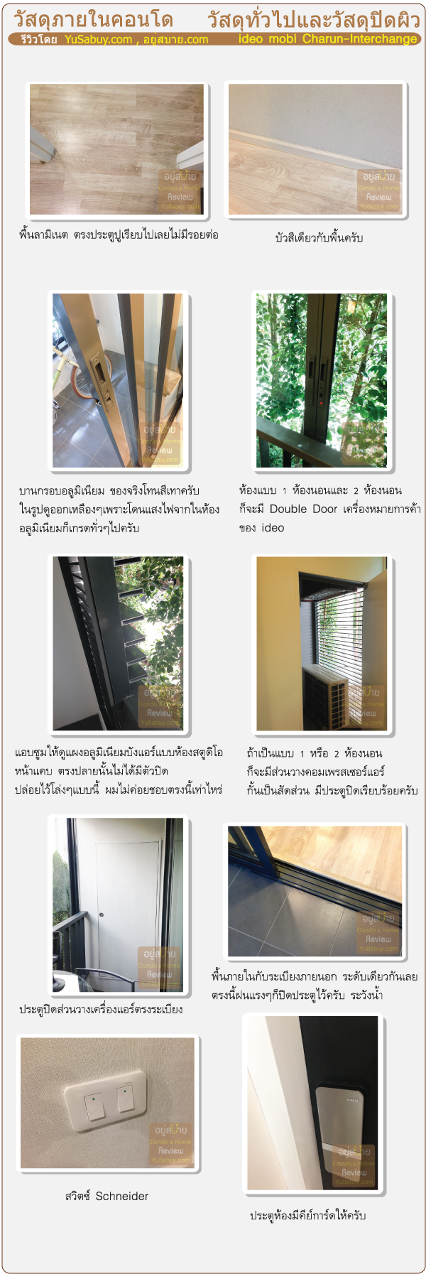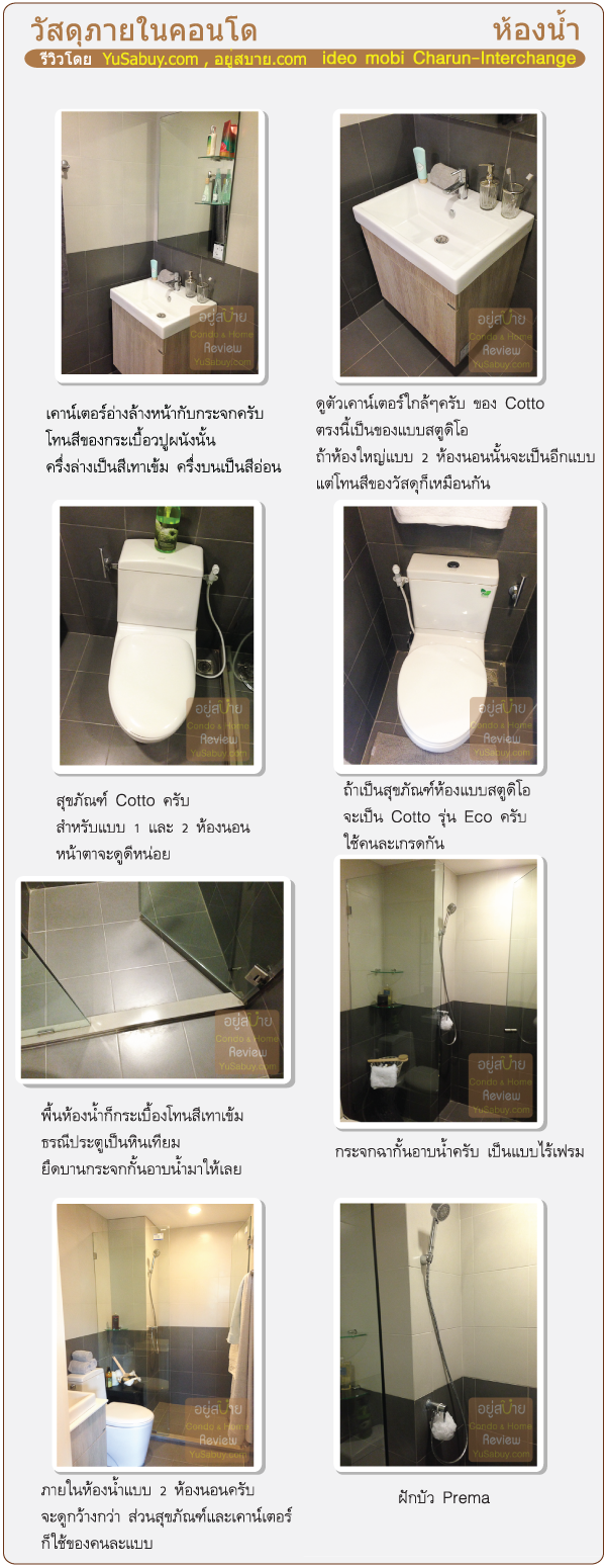 ภาพรวมของวัสดุ ideo mobi Charun-Interchange นั้นให้มากลางๆครับ ตามราคา ห้องที่พื้นที่ใหญ่ขึ้นก็เปลี่ยนวัสดุบางชิ้นให้ดีกว่าห้องขนาดเล็ก เช่นใช้สุขภัณฑ์หรืออ่างล้างหน้าคนละรุ่น ถ้าห้องแบบสตูดิโอนี่สุขภัณฑ์ก็จะเป็นรุ่นราคาประหยัดไป ห้องแบบ 1 และ 2 ห้องนอนก็ให้ Double Door มาแต่แบบสตูดิโอไม่ให้ เรียกว่าเกรดของวัสดุอุปกรณ์ก็อัพตามขนาดพื้นที่ไปด้วย ไม่ได้ให้เกรดเดียวกันทั้งหมด ตรงนี้ก็ดีครับเรียกว่าแฟร์ๆดีกับคนที่จ่ายราคาห้องแพงกว่า