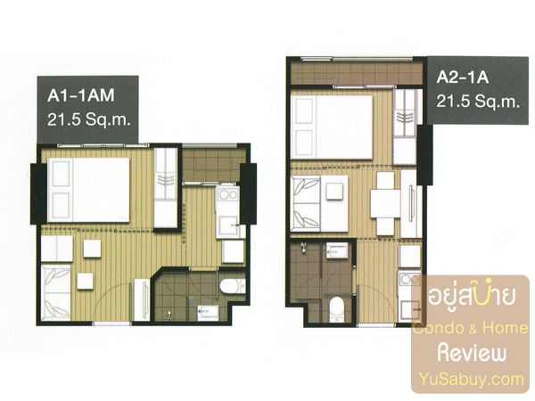 แปลนเล็กสุดเป็นแบบสตูดิโอครับ มีมาให้เลือก 2 แบบคือแบบหน้ากว้าง(รูปซ้าย) และแบบหน้าแคบ(รูปขวา) การจัดวางตำแหน่งของฟังก์ชั่นจะต่างกันครับ แบบหน้าแคบนั้นสัดส่วนห้องค่อนข้างจะลึกหน่อยส่วนแบบหน้ากว้างนั้นห้องค่อนข้างจะตื้นกว่าพอควร