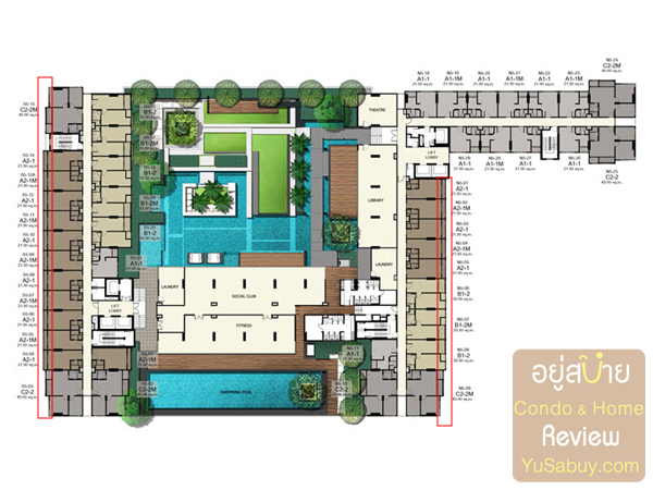 พอมาดูผังชั้น 5 ที่เป็นชั้น Facilities หลักก็จะเห็นได้ว่าระเบียงนั้นลึกน้อยกว่าชั้น 4 ชั้นอื่นๆที่สูงขึ้นไปก็จะระเบียงเท่านี้นะครับ (ลองดูเส้นกราฟิกสีแดงที่ทำไว้ให้) ส่วนด้านพื้นที่ในคอร์ทนั้นจัดมาได้ดูบรรยากาศดีทีเดียว