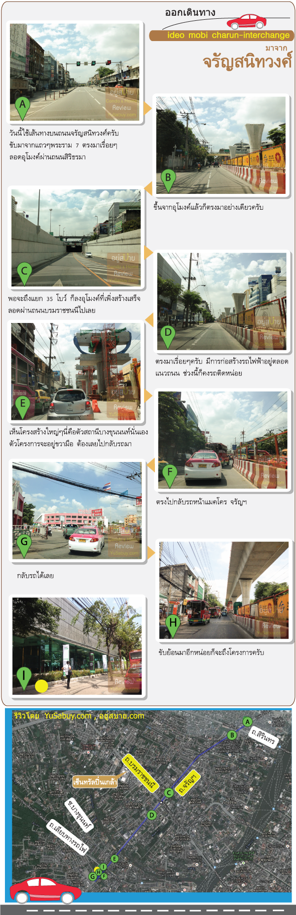 ที่ตั้งโครงการนั้นอยู่บนถนนจรัญสนิทวงศ์ช่วงตัดกับถนนเลียบทางรถไฟตลิ่งชันครับ เป็นบริเวณใกล้ๆกับสี่แยกบางขุนนนท์ซึ่งเป็นจุดตัดของรถไฟและรถไฟฟ้ารวม 3 สายที่จะมาในอนาคต เลยทำให้ ideo mobi ตัวนี้ใช้ชื่อว่า “จรัญ-อินเตอร์เชนจ์” นี่แหละครับ วันนี้ผมขับรถมาจากทางพระราม 7 ซึ่งก็ตรงมาอย่างเดียวเลย เริ่มทำกราฟฟิกให้ดูตั้งแต่ช่วงทางลงอุโมงค์ที่ลอดใต้ถนนสิรินธรไป ให้เราขับรถตรงไปเรื่อยๆอย่างเดียวครับ บนถนนจรัญฯรถก็จะติดหน่อยเพราะก่อสร้างรถไฟฟ้าสายสีน้ำเงินอยู่ตลอดแนวทำให้ถนนนั้นเหลือวิ่งได้แค่ฝั่งละ 2 เลนเอง
