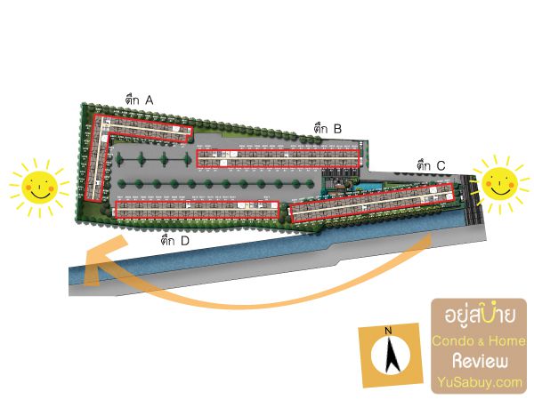 ตัวอาคาร B, C และ D ที่เป็นเส้นตรงนั้นด้านหน้าที่หันออกสู่ถนนเป็นฝั่งที่โดนแดดซะมาก ในขณะที่ฝั่งที่หันเข้าหาในคอร์ทอาจจะไม่ค่อยเห็นวิวแต่ก็จะได้เรื่องร่มเข้ามาแทนครับ ได้เปรียบเสียเปรียบกันคนละอย่างต้องลองดูความชอบของแต่ละคนครับ