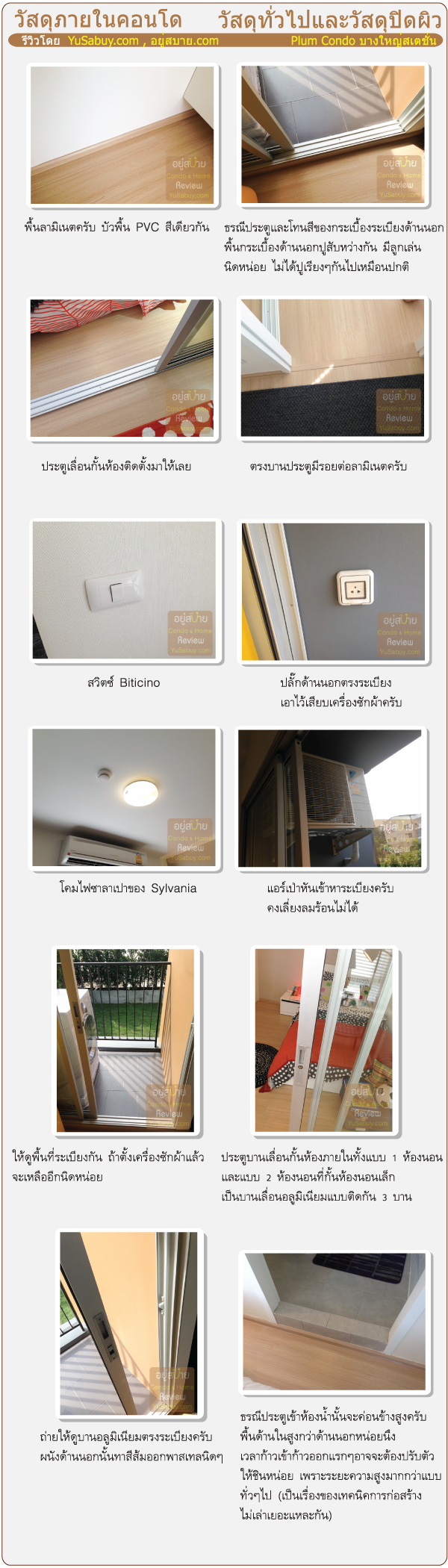 ภาพรวมของวัสดุในพลัม คอนโด ให้มาโอเคกับแบบคอนโดราคาประหยัดครับ พื้นลามิเนตที่ให้มาถ้าเทียบผิวสัมผัสกับเกรดวัสดุแล้วผมว่าดูดีกว่าที่ใช้ในทาวน์เฮ้าส์ราคาประหยัดที่พฤกษาทำทั่วๆไป ถ้าสังเกตในดีเทลเล็กๆน้อยๆจะเห็นความพยายามดีไซน์ pattern กระเบื้องต่างๆ เช่นพื้นระเบียงหรือผนังห้องน้ำ มีการปู pattern กระเบื้องสับหว่างกันไม่ได้ปูเรียงกันธรรมดาทั่วๆไป