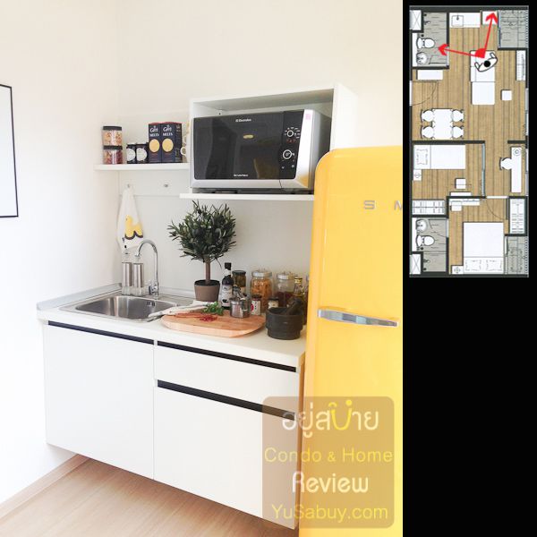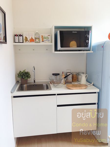 ส่วนครัวถ้าได้แถมมาจะหน้าตาแบบนี้นะครับ ตัวท็อปเคาท์ตอร์เป็นเมลามีนสีขาว ตัวชั้นก็เป็นพาทิเคิลบอร์ด