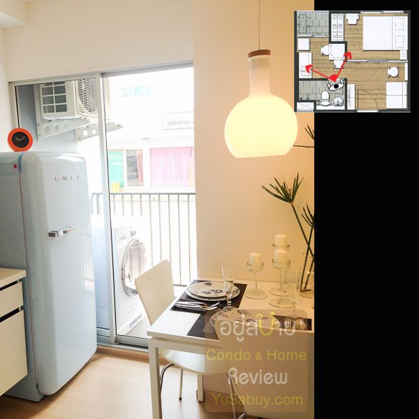 แปลนแบบหลักของพลัม คอนโด เป็นแบบ 1 ห้องนอนครับ กั้นห้องมาให้เรียบร้อย ในแง่ของฟังก์ชั่นนั้นถือว่าวางมาได้ครบๆดีในพื้นที่ประหยัด ผมว่าแปลนตัวนี้เป็นอีกตัวที่เอาไปสู้กับเจ้าพ่อสเปซเล็กอย่างไซส์ 22.5 ตารางเมตรของ LPN ได้สูสีทีเดียว (ดูเทียบตัวอย่างแปลน 22.5 ตารางเมตรของ LPN) จุดที่ผมว่าพฤกษาทำออกมาได้ดีกว่าคือสามารถวางโต๊ะรับประทานอาหารแบบหันหน้าเข้าหากันมองตากับแฟนได้ไม่ต้องนั่งเรียงแถวกิน รวมๆแล้วแปลนแบบ 1 ห้องนอนของ Plum Condo ก็ถือว่าจัดมาได้ค่อนข้างดีครับ