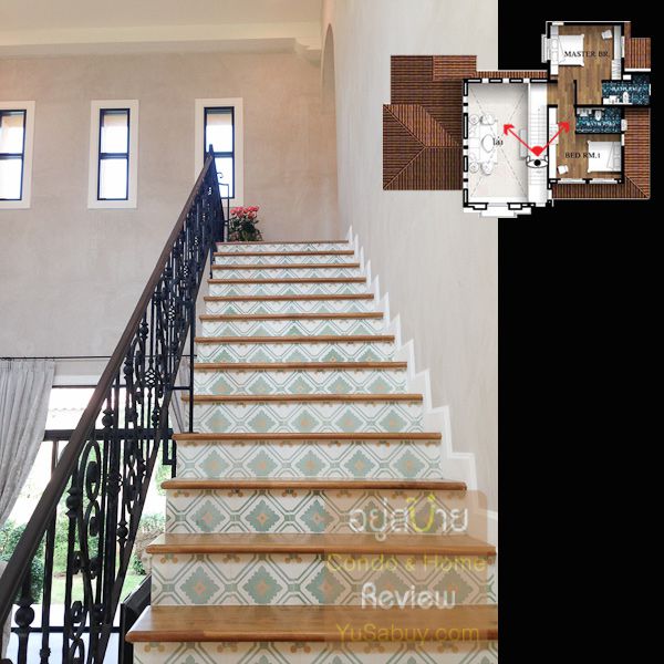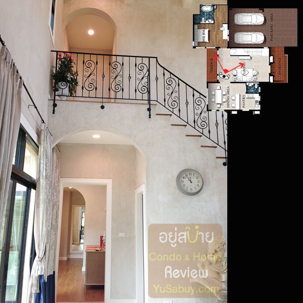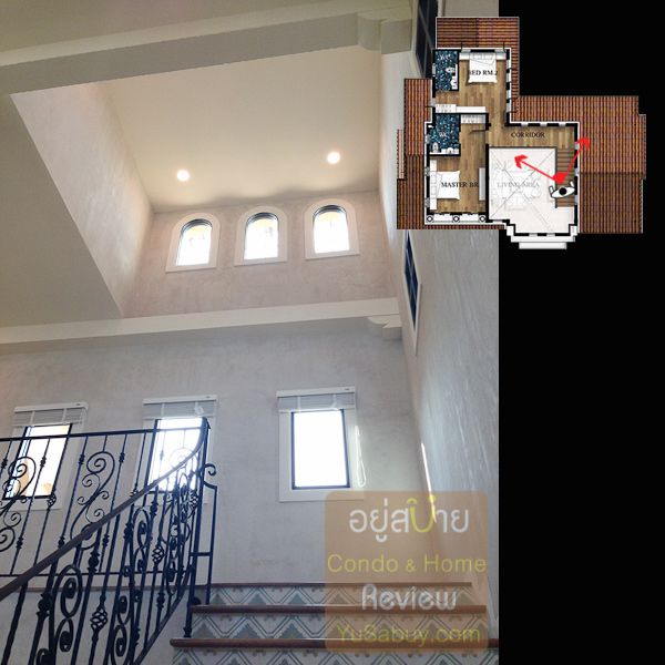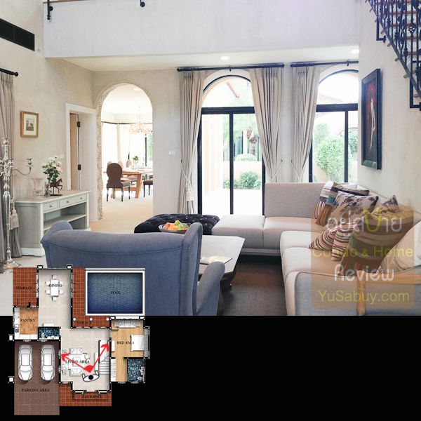 ถ้าลองดูการวางตำแหน่งห้องชั้นล่างจะเห็นว่าทั้งห้องพักผ่อน , ห้องรับประทานอาหาร และห้องนอนชั้นล่างนั้นสามารถเห็นคอร์ทที่มีสระว่ายน้ำได้ทั้งหมด แปลนชั้นล่างนั้นสวยน่าอยู่ทีเดียว ในโถงนั้นเป็น Double Space เช่นกัน พอขึ้นบันไดไปแล้วก็จะเดินตามแนวทางเดินไปยังห้องนอนอีกฝั่ง ตรงจุดทางขึ้นลงบันไดนี้ถ้าไปดูในสเปซจริงจะเห็นเป็น Double Space ซ้อนกันอีกชั้นนึงครับ