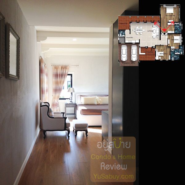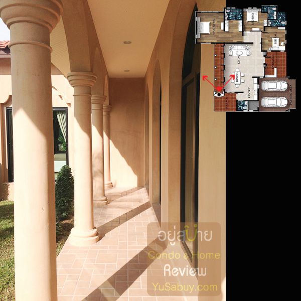 มาถึงแบบที่ 3 ซึ่งชื่อว่าแบบ Hermes ครับ เป็นบ้านชั้นเดียว ฟังก์ชั่นพวกห้องนอนจะจัดแยกไปอยู่อีกฝั่งนึงชัดเจน ในขณะที่สเปซส่วนพักผ่อนและรับประทานอาหารก็อยู่รวมกัน ถ้ามองออกไปจะเห็นเป็น terrace ที่มีแนวโถงระเบียงเสาอยู่ โดยส่วนตัวแล้วผมค่อนข้างชอบมุมนี้เป็นพิเศษครับ ทำมาสวยเชียว มองจากห้องนอนก็ได้ เดี๋ยวมีรูปถ่ายตรงนี้มาให้ดูกันด้วย รวมๆของแบบนี้เท่าที่เข้าไปดูในบ้านตัวอย่าง ผมรู้สึกว่าสัดส่วนของห้องนอนเล็กทั้ง 2 ห้องแคบไปนิดนึงครับ ถ้าวางเตียงใหญ่ๆแล้วมันพอดีไปนิดนึง