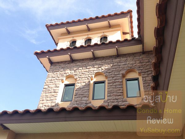 วัสดุที่ใช้ในโครงการนี้ก็จะแปลกตากว่าวัสดุในโครงการบ้านเดี่ยวราคาแพงทั่วๆไปเนื่องจากสไตล์ที่วางไว้เป็นแบบ Tuscany ครับ ภาพรวมนั้นทำให้ออกมาดูไม่เนี้ยบแบบตั้งใจ ใช้วัสดุที่มีผิวสัมผัสหยาบ ผนังฉาบก็จะดูดิบๆหน่อย อย่างกระเบื้องในพื้นห้องถ้าไม่ใส่ slipper เดินก็จะสากเท้าหน่อยครับ เป็นการถอดแบบดีไซน์ออกมาจากของจริงๆเลย รวมๆดูออกมาแล้วอารมณ์คล้ายๆพวกรีสอร์ทซะมากกว่า ใครที่ชอบงานเนี้ยบเป๊ะคงเป็นคนละแนวกันกับบ้านแบบนี้ครับ ต้องคนชอบอะไรดิบๆนิดนึง